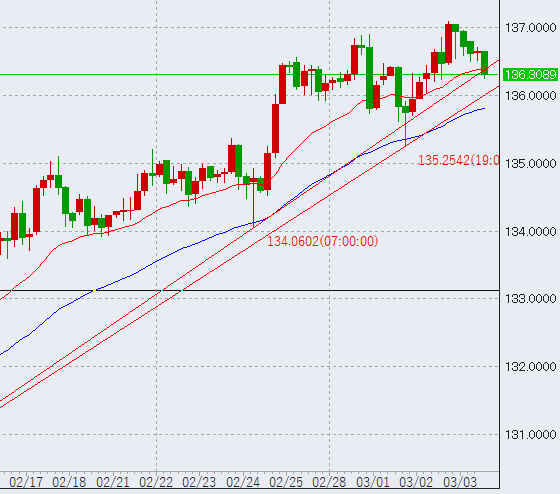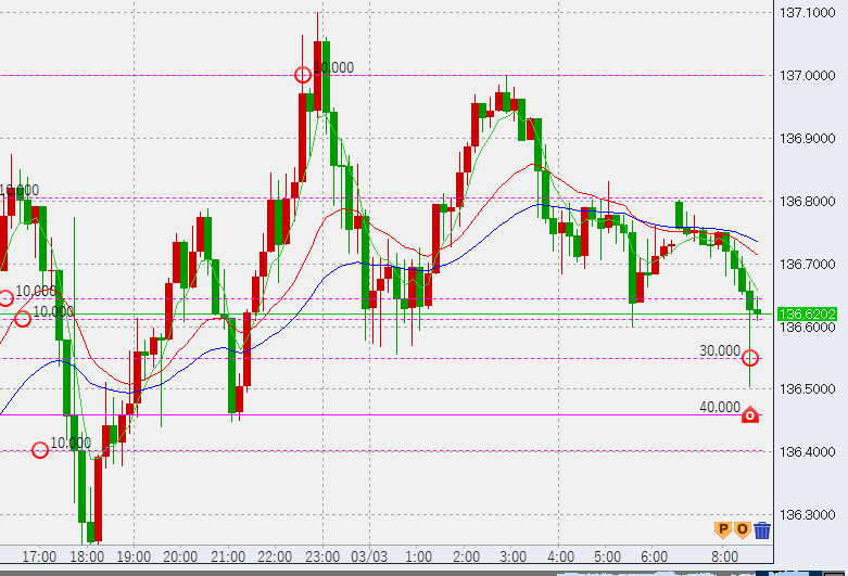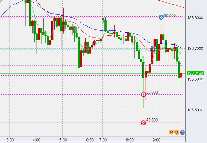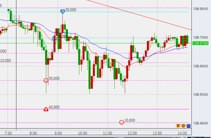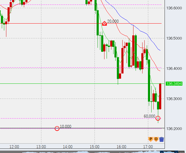 日本時間開始後、低調な値動きです。高値に2万売り。もう少し下げそうな雰囲気出てます。ポイントは前日の安値、136.25を割るかどうかですが、ここを下抜けるとさらに下押ししそうです。