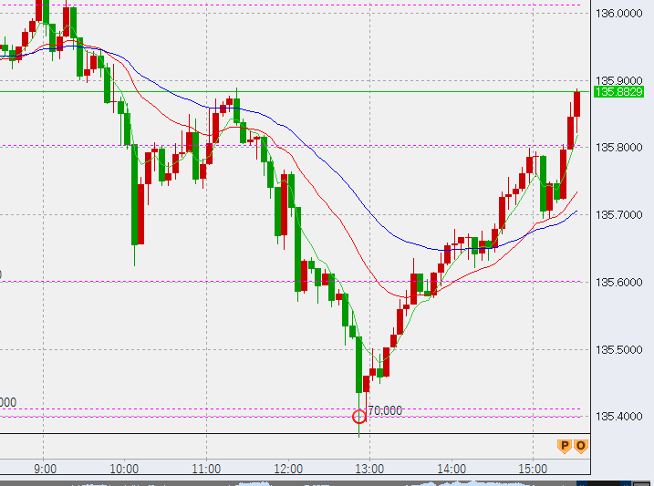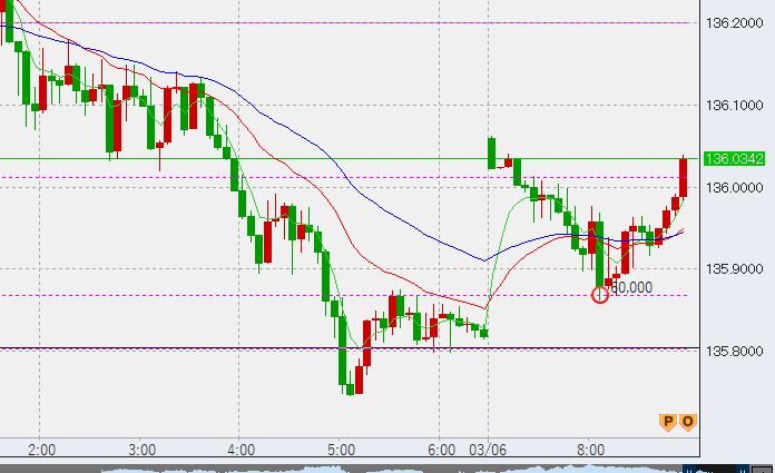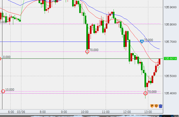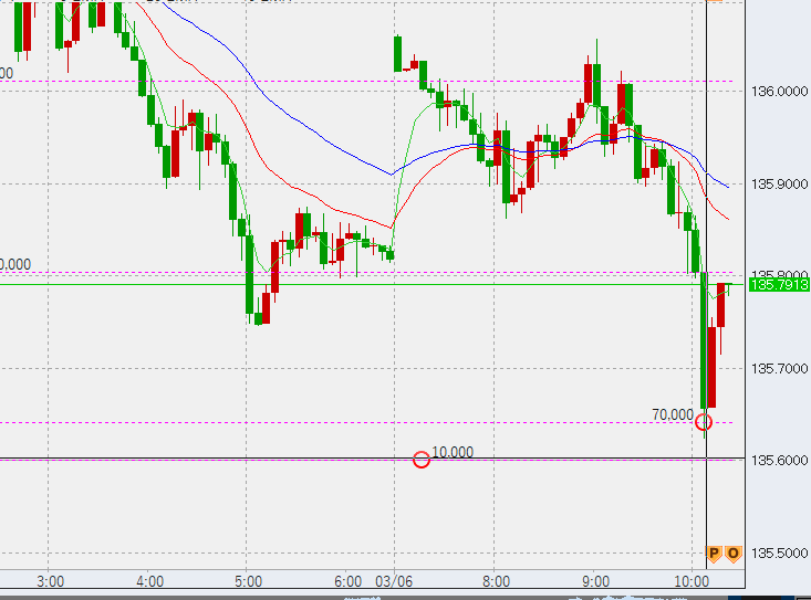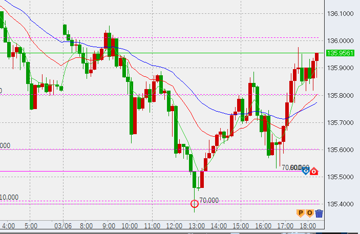 ドル円は前週末、米国債利回り低下にともない、結局135.8付近までズルズルと下げてきました。しかし米経済情勢はやはりインフレが根強く、今後も当分利上げを継続していくだろうという見方から、ドル強に傾く情勢となっています。このため本日も買い優勢として取引を進めていきます。