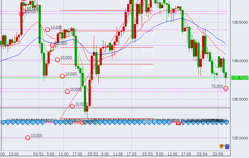 なお週末かなり悩んだ挙げ句、日足が崩れるとさらに1-2円程度下げる可能性ありとの判断から、今回は日足決済とすることに決めました。このため、長期買いの決済ラインを前回日足安値、135.2に設定。※以下画像参照(決済金額は120万円程度)。