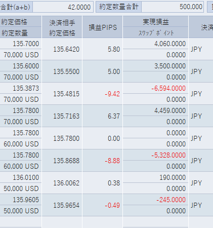ちなみに途中買ったポジションは損切り分・損益分を相殺させるため(繰り上げ法)、今日のように下げてきても結果はプラスとなっています。