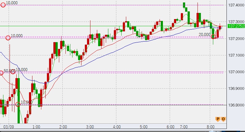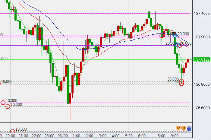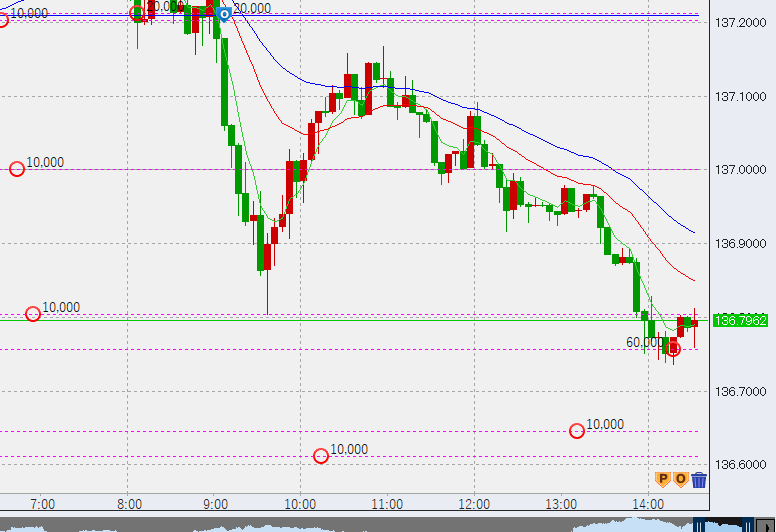 本日も前日同じ作戦となります。プルバックが入ったので5-7万程度の短期買いがメインです。また、138円を超える値動きとなった場合は高値売りも行っていきます。