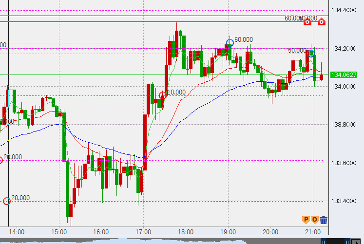 本日も短期足は下落の流れですので、短期売りがメインです。いつものように繰り上げ法を用い、高値を形成する度に売り続けていきます。