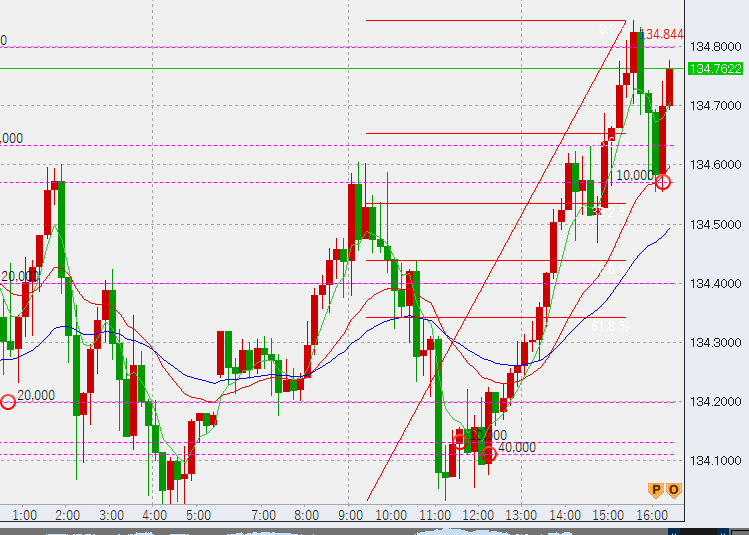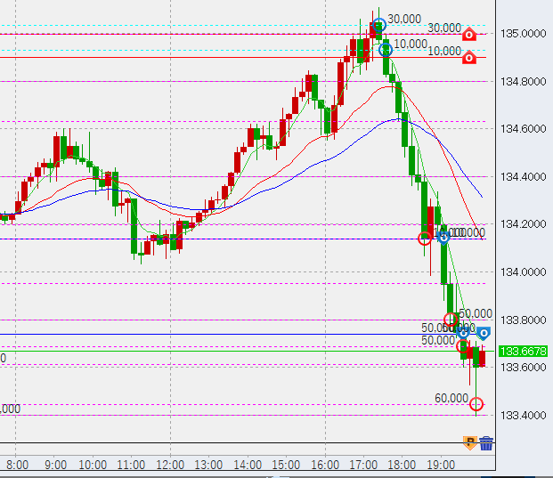 本日8時頃の10分足です。前日の買い5万が生きており、また134.2に2万買いを投入しているため、あわせて短期は7万買いです。