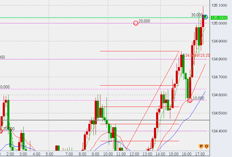 17時過ぎさらに上昇し135.1付近まで上値伸ばす。ここまでくればさすがに高値3万売り。これで4つの1時間足高値と並んだため、弾みを付けた後、もう一段上昇する可能性が高まりました。本日発表の米経済指標に注目です。