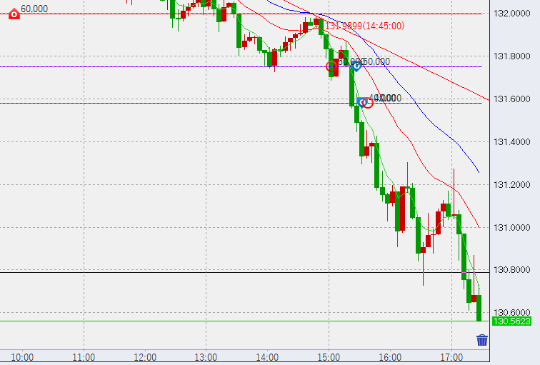 15時頃131.75付近まで下落。既に1時間足上昇幅の70%程度下落しているため、高値形成後さらに下落していく可能性があります。