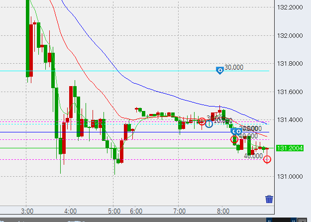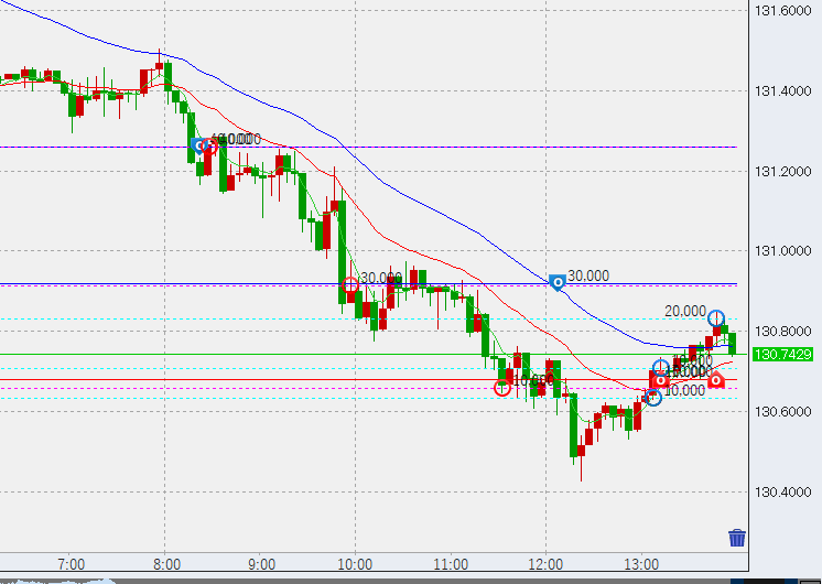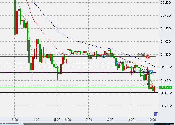 10時過ぎさらに下落。130.9付近で3万買い。徐々に日足安値に迫っています。