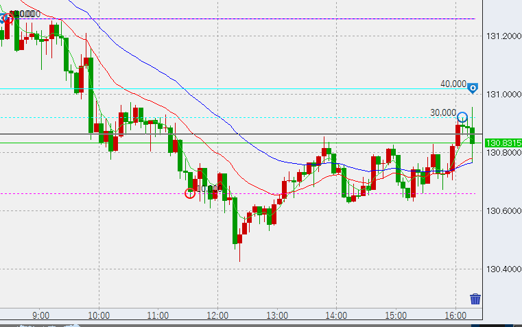 14時頃、130.4付近まで下落後、やや反発。早い段階で売り始めていきます。