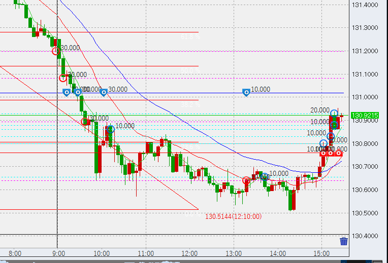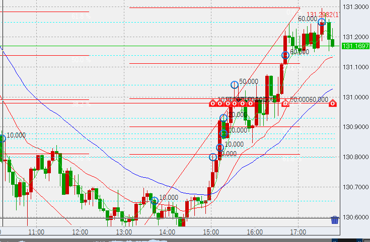 18時頃、高値(131.3付近)に6万売り、下げるのを待つ状態です。