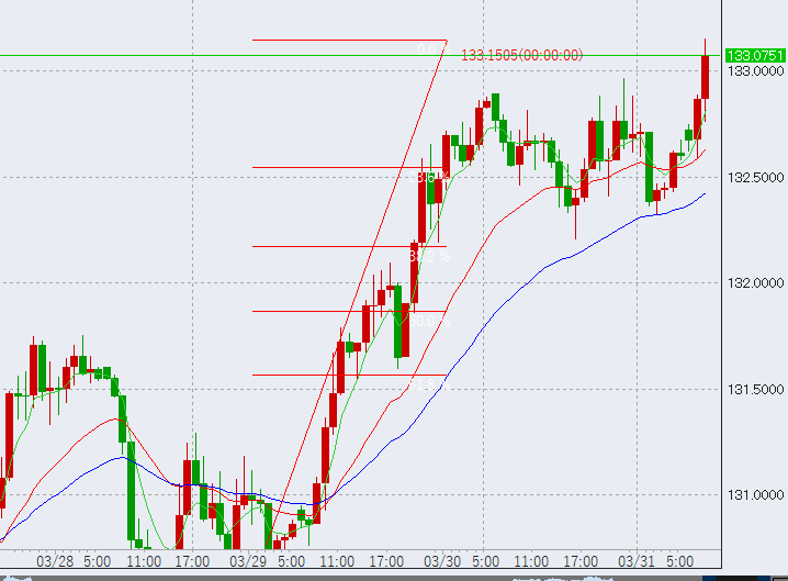 本日は日本時間前から上昇し高値を更新。133.1を付けました。一旦目処となる133円を付けたため、ここからバックに入る可能性もあり注視です。