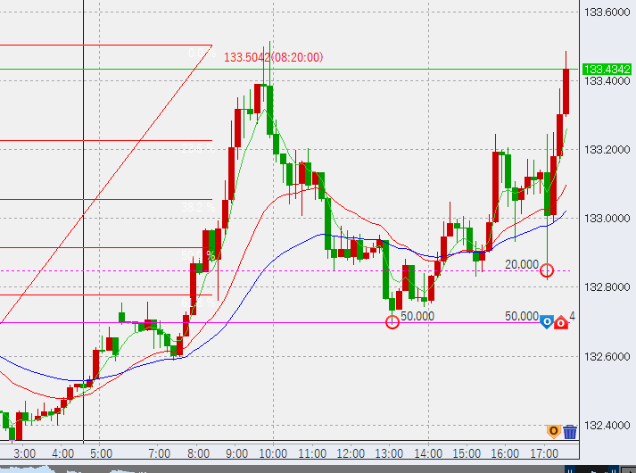 17時過ぎ強めに上昇。目処となる日足高値・133.8付近まで上昇するかに注目です。
