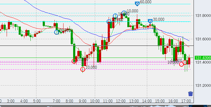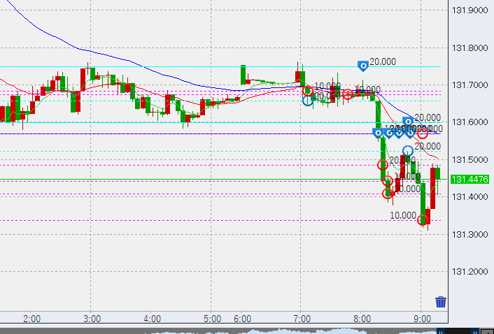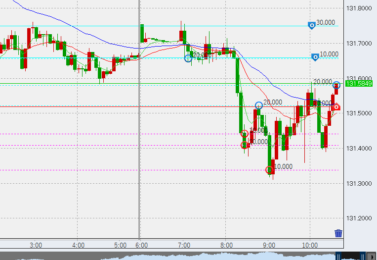 日本時間入り後、底を131.3付近まで掘り下げ。底で4万買い。上部はトントン決済とします。