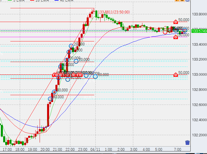 その後133円ちょい上まで下げてきましたが、まだ前日上昇幅の50%には届かず。このためもう少し下げそうですが、どうでしょうか。