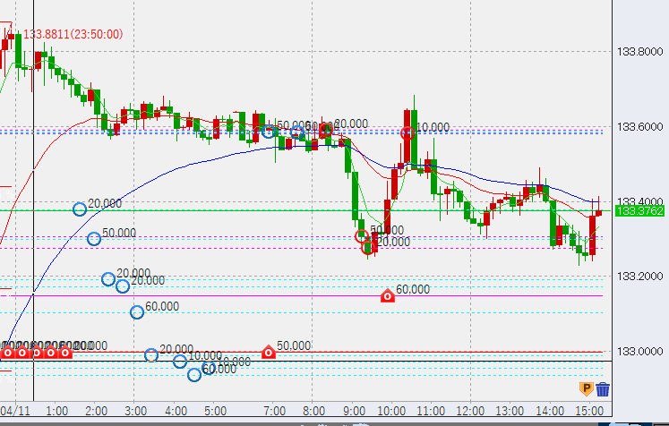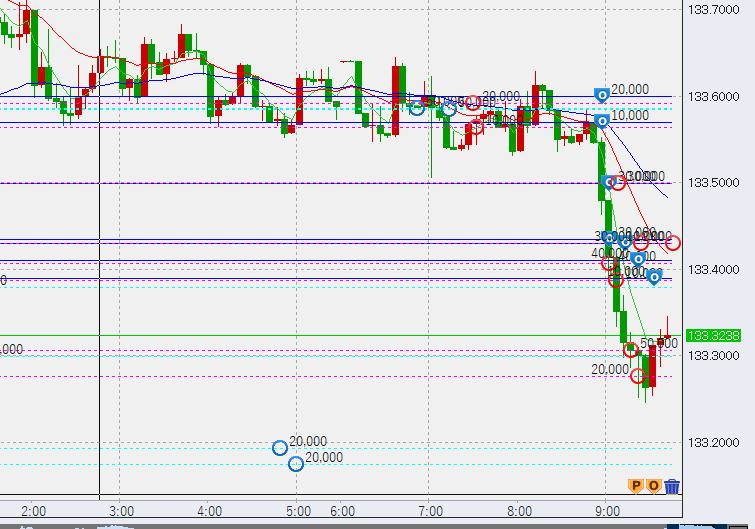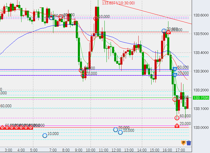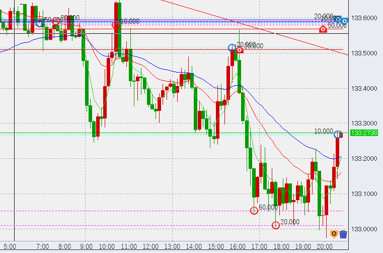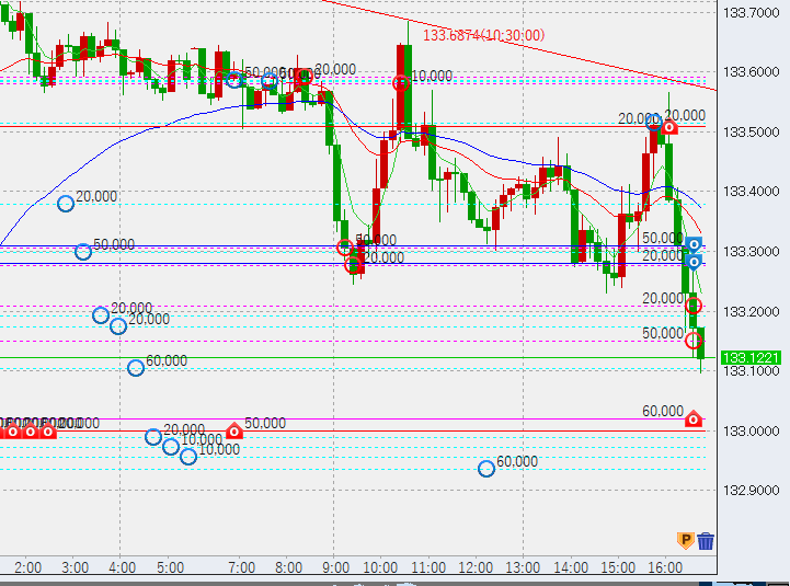 欧州時間後下落。高値(133.5)に2万売り入れておいてよかったです。1時間足安値の目処は132.7-133円近辺と見ています。