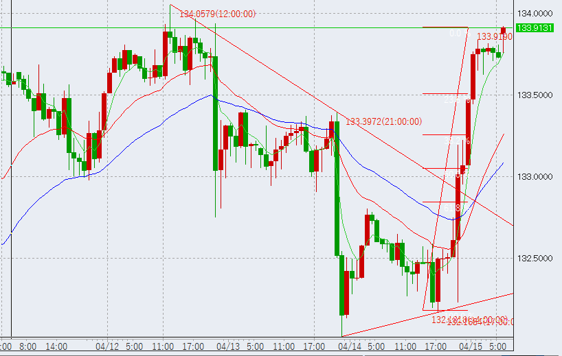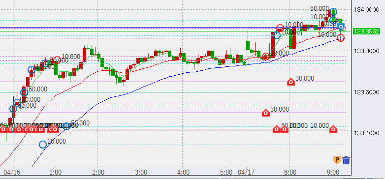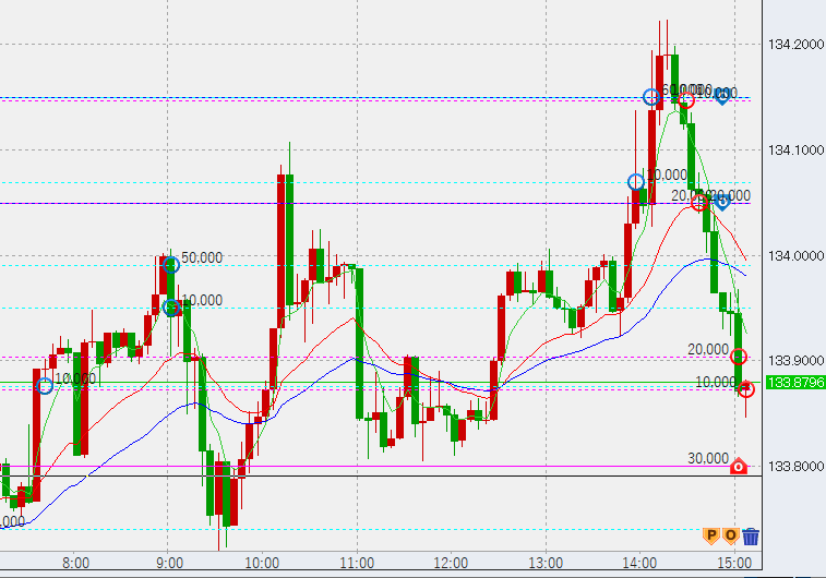 画像は1時間足。高値圏にあり、これからプルバックしてくる形ですので、まずは高値売りからスタートです。早朝、133.9円付近に6万売りを入れています。