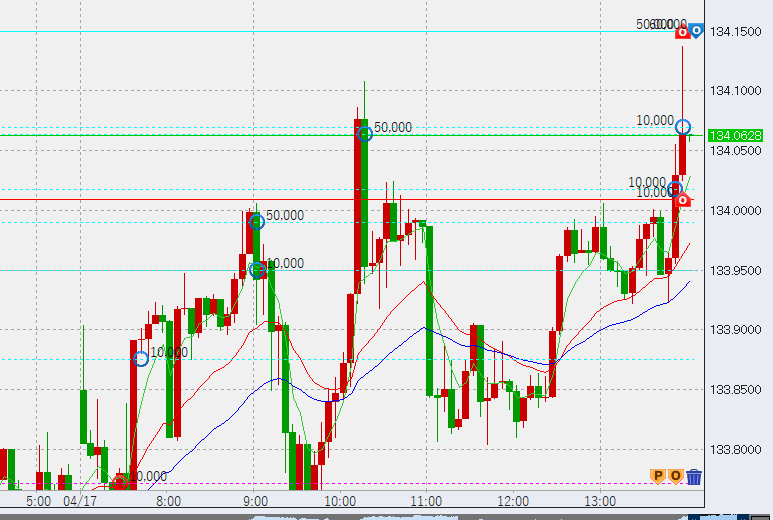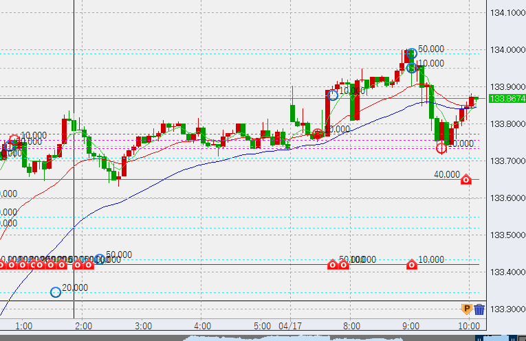 日本時間入り後、高値134円を付けたので高値6万売り追加です。今日は先週末の売り残しがあるためポジションがごちゃごちゃしており、この処理に朝から忙しい状態です。