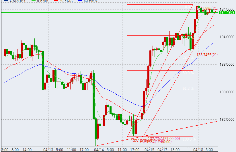 9時過ぎ1時間足は上昇TLを割る動き。このため一旦下落する可能性がありますが、どこまで下げてくるかは不透明です。22%ラインは134円付近となっており、