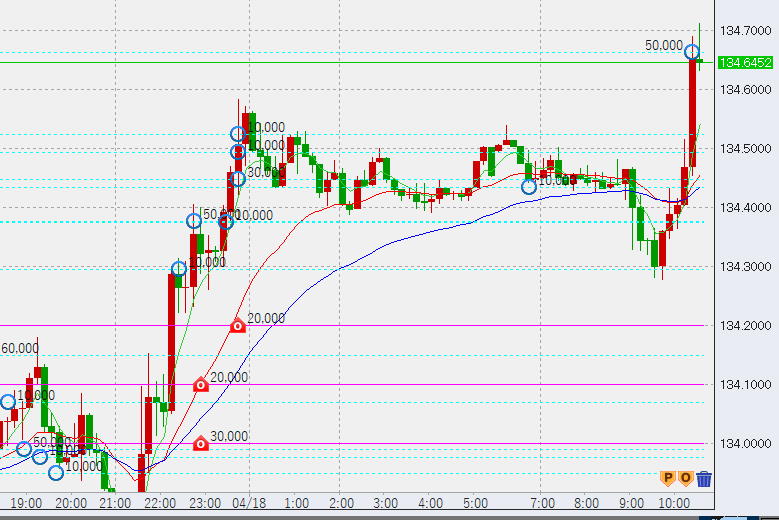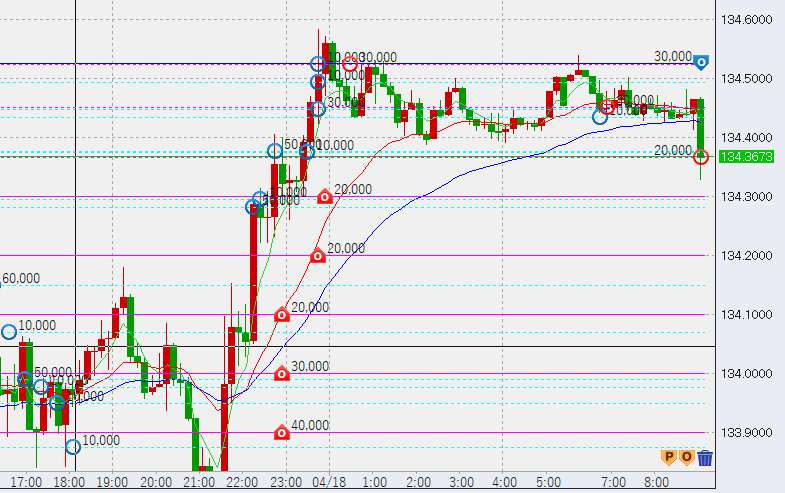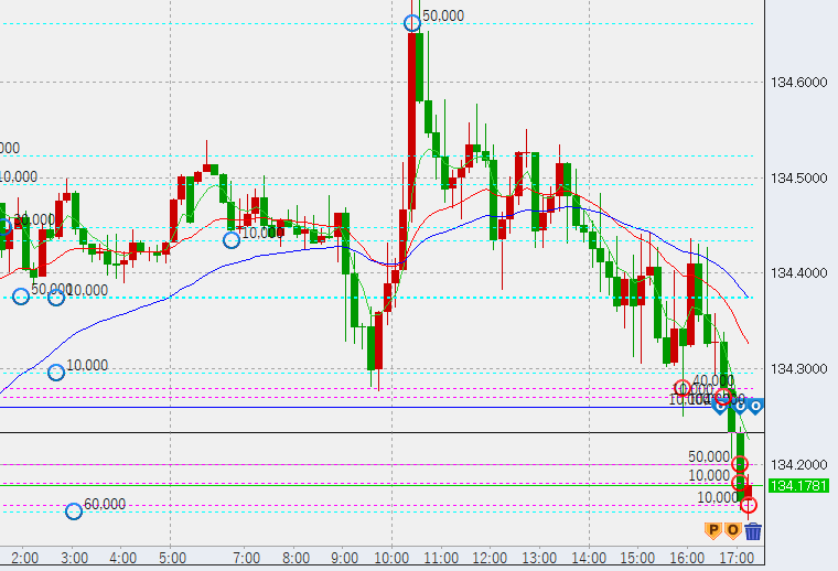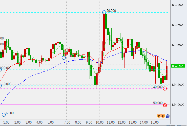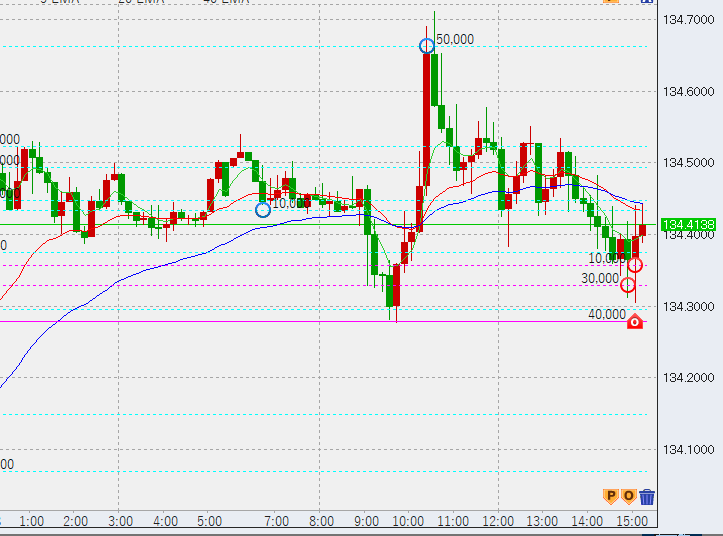 15時過ぎ下げ渋り。安値に4万買い。まだ1時間足安値(134.27)は割っておらず、1時間足は上昇相場継続ですが、この後安値を割るか、高値更新できない場合はレンジ入りとなり、下落の可能性が高まります。