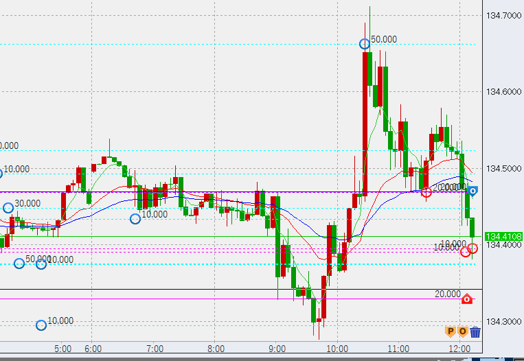 12時過ぎ低調となり、ようやく4時間足プルバック開始か!?売り残りがあるため、それを相殺するため高い水準から買い入れです(本来こんなことする必要ないのですが、仕方ありません)。正確には、本日安値(134.27)下抜けでプルバック入りとなります。