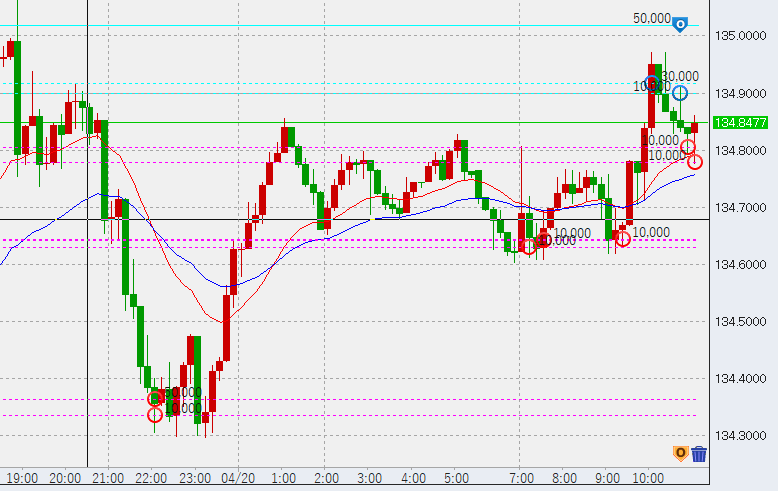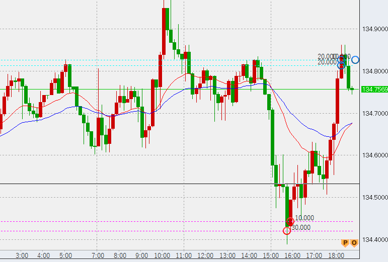 18時過ぎ反発強める。134.7付近で2万売り追加し合計売り6万。下げそうな場面ですがどうでしょうか。