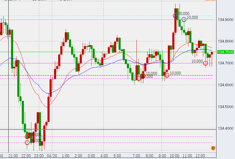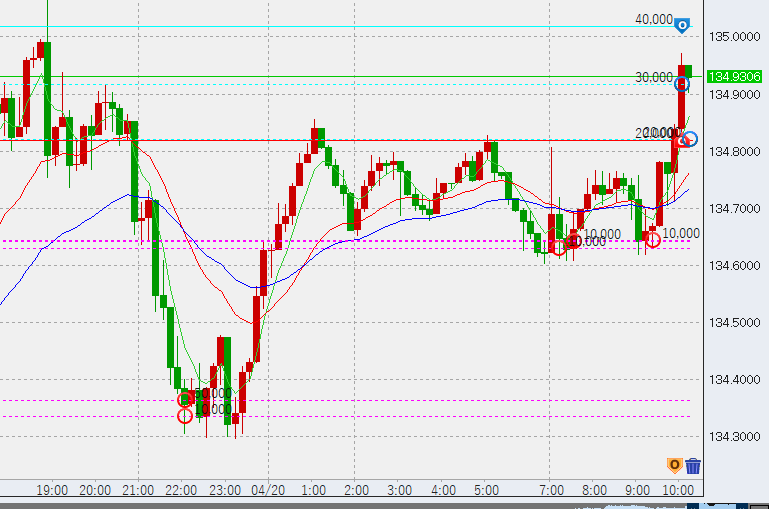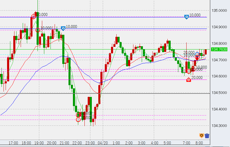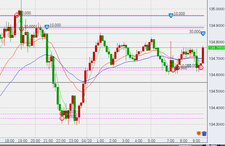 画像は今朝の10分足。前日の買い6万が底にありますが、これは今日の夜に備えて下げてきても決済せず、温存しようと考えています。買いは現時点で合計11万。売りは134.75付近に2万ですが、上がったところで追加していく予定です。