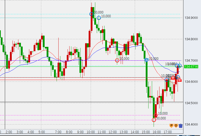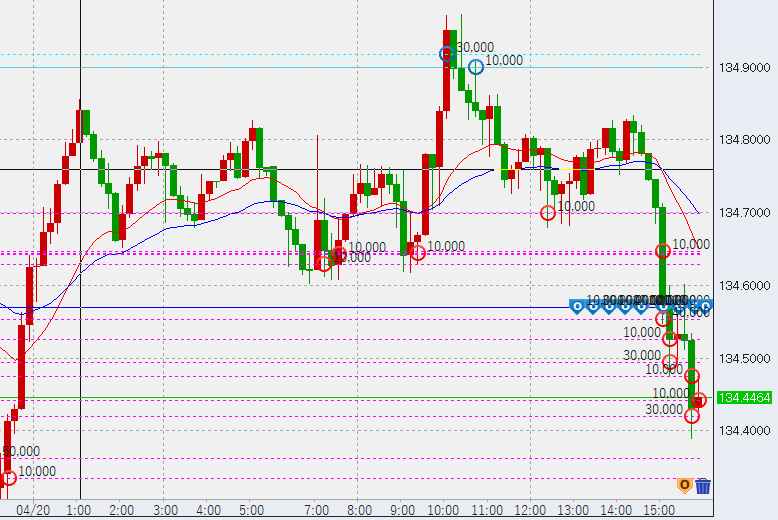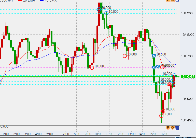16時過ぎ米国債利回り急低下し、134.4付近まで下げてきました。底で10万買い。上部の買いについては順次決済予定です。この下げで4時間足のレンジ入りが確認できましたので、上げたところで売り追加となります。