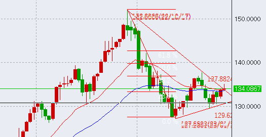こちらは週足。下降トレンドライン上に足が残っており、このまま前回高値(138円)を超えていけばドルの強さが明確となります。