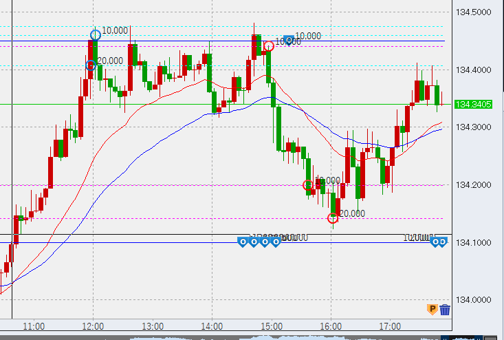18時、1時間足安値が決まり、買いの決済ラインを134.1に移動。このラインで大体7万円程度の利益となります。