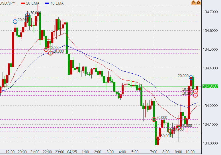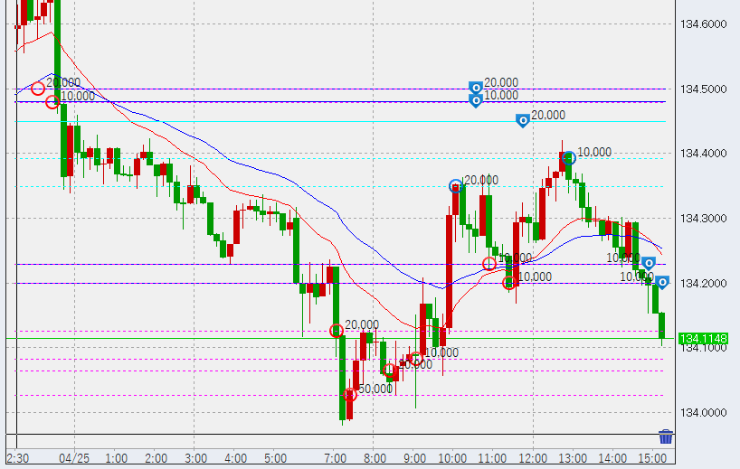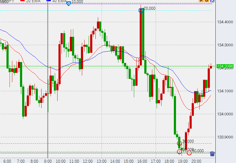 13時やや高い。高値に1万売り追加。また、1時間足安値が134.16付近で決まりましたが、ここでの利益は1万円にも満たないためパス。このため、再び下げてくれば追加買い投入となります。