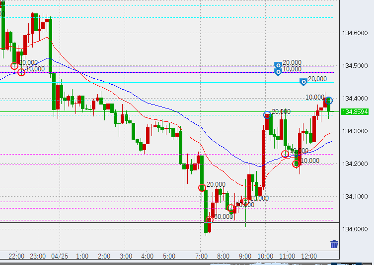 10時半上げてきて少しすっきり。現在安値買いは12万、売りは7万です。134.5付近の買いはトントン決済予定。