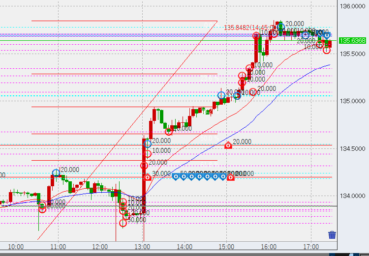 17時過ぎやや停滞。ですがまだ買っていきます。細かくて分かりづらくてすいません。キリのいい136円までは伸びそうですが、もしかするとさらに伸びるかもしれません。