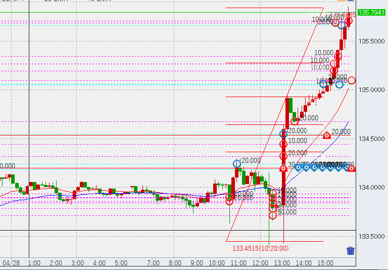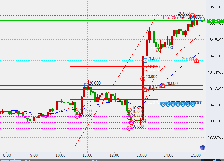15時過ぎまだ伸びてます。ただ、135.1の高値に接したため、一旦下落しやすい位置と見て高値3万売り。ここから落ちてきたらまた勝っていく作戦です。