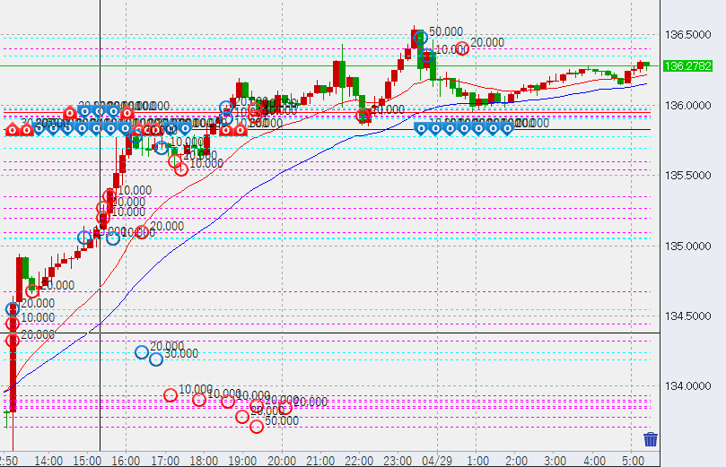 買いの決済ラインは、現在2つ下の1時間足安値(135.83)下に敷いています。この地点で大体+25万円程度。なおぶつけた売りも同時にここで決済(損切り)します。