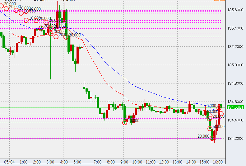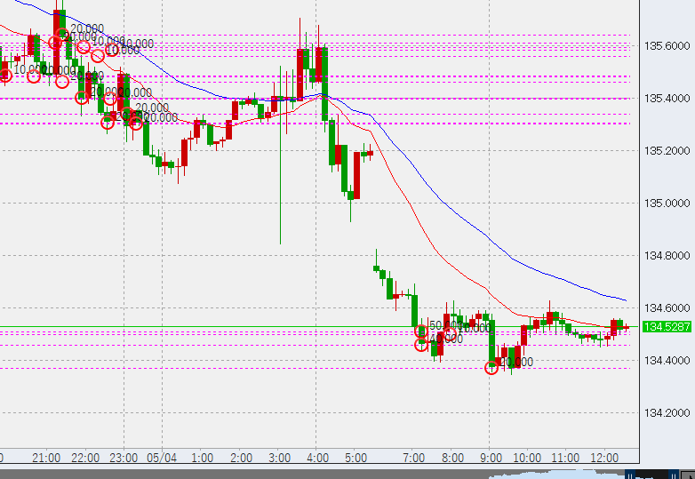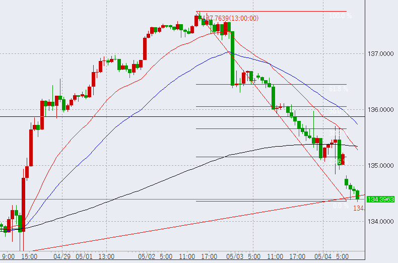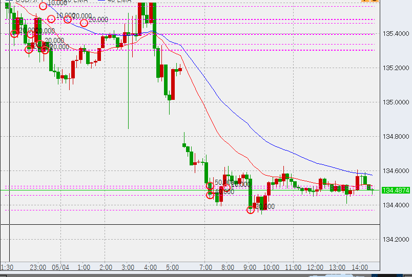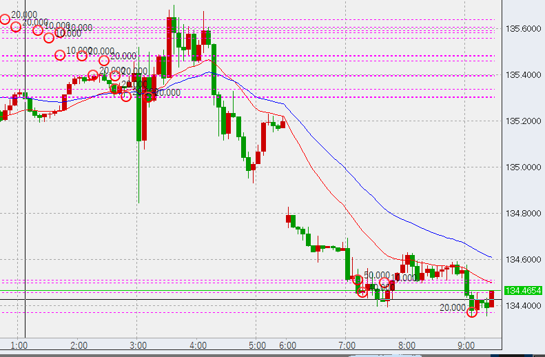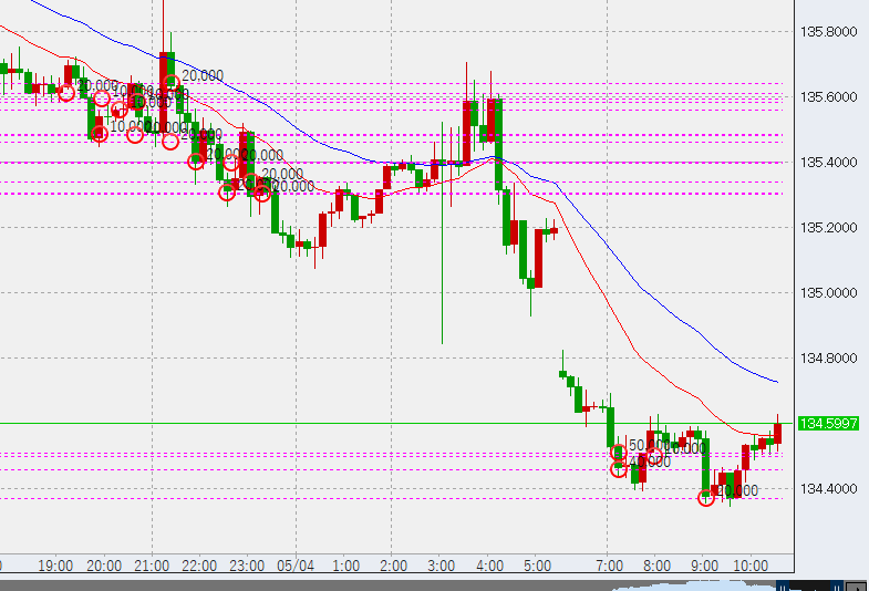 11時前。この後1時間足の高値が135.7を超えるか、または安値が134.35を上回ればトレンド転換の予兆となります。