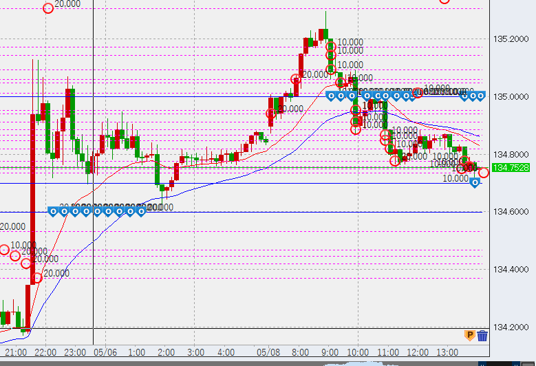 1時間足上昇のため、下部の買いポジションの決済ラインを安値134.6に設定。