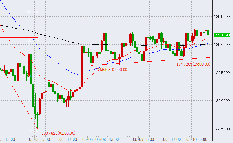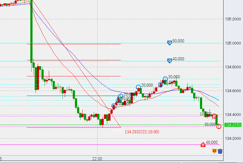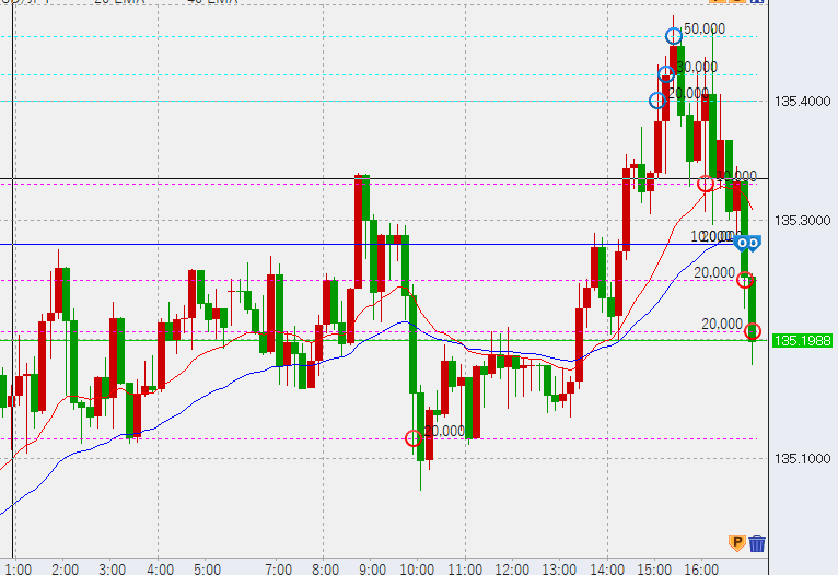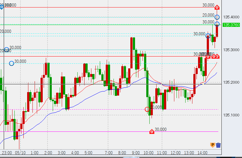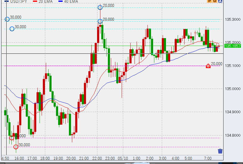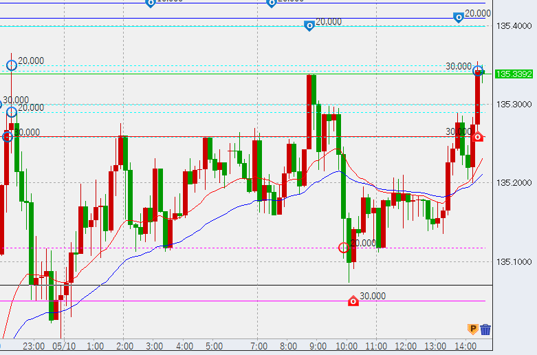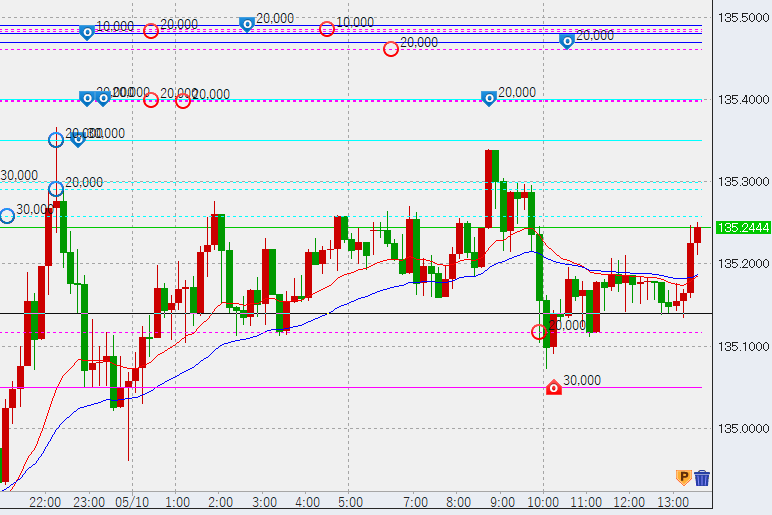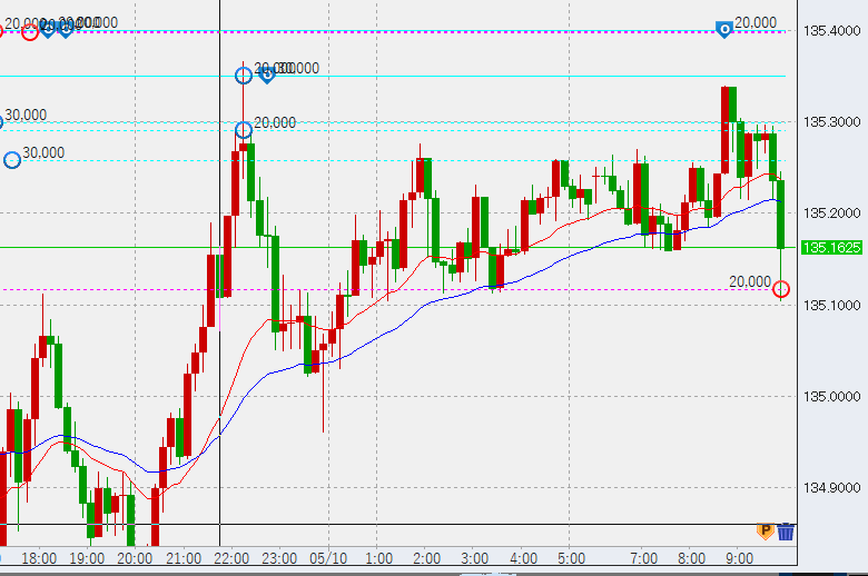 画像は早朝の10分足。高値付近に位置しており、CPI懸念から日中はジリ下げとなる予感です。まずは135.1に2万の追加買い。