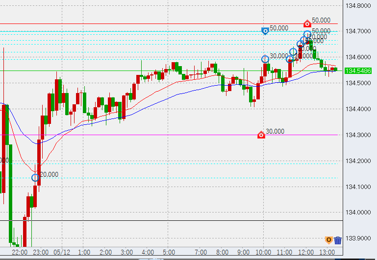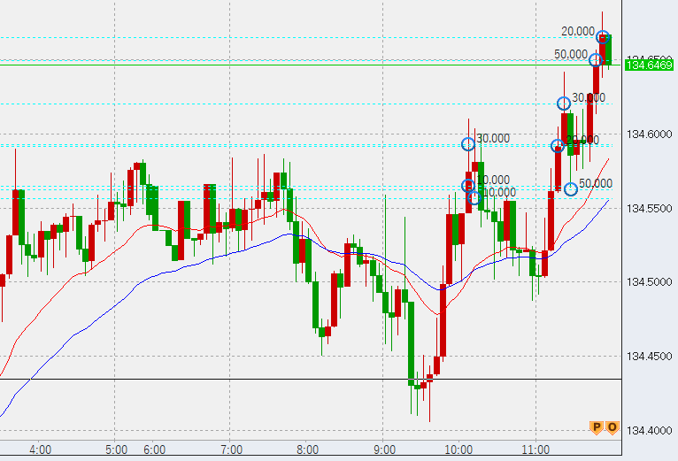 朝の状況です。売りの決済ラインは上部と下部に分けました。このラインを切ればまた売りを投入。買いについては、前日上昇幅の23%程度から開始予定です(現状では134.4)。