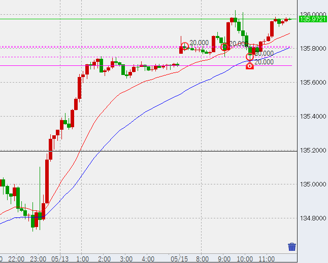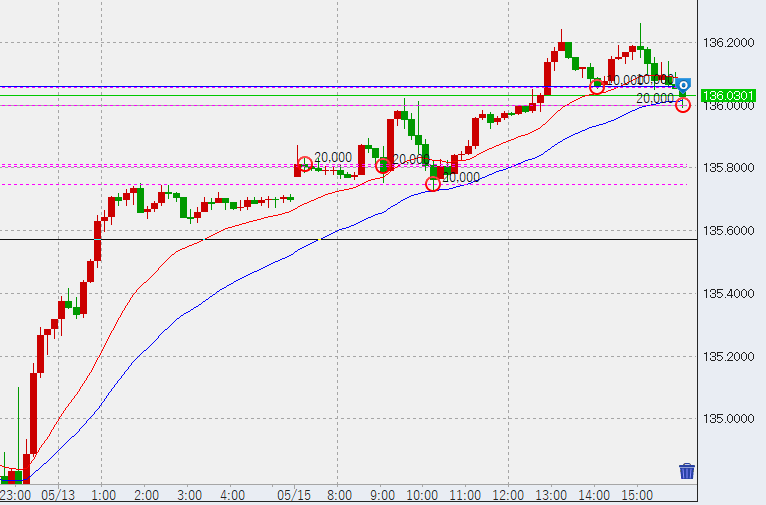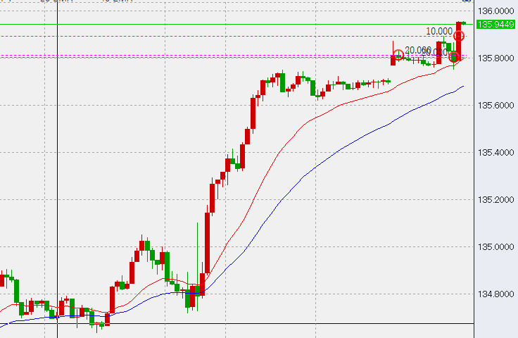 12時過ぎ1時間足安値が135.72付近で確定。このため、このラインを切れば売り開始です。問題は、買いをどう処理するかということですが、原則的にはここを切ってもまだレンジ相場のため買いは維持。しかし戻りでトントン決済にしようかと考えています。