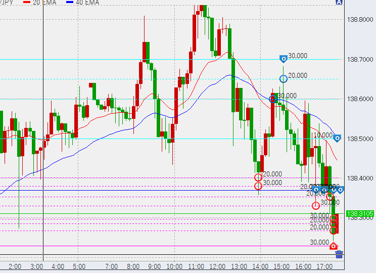 17時過ぎさらに下落。これで1時間足は下降相場入りしましたが、本日夜には製造業PMIなど米経済指標の発表があるため底買い。しかしこれを切れば売りのみとする作戦です。