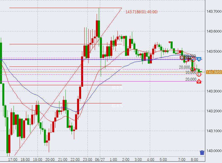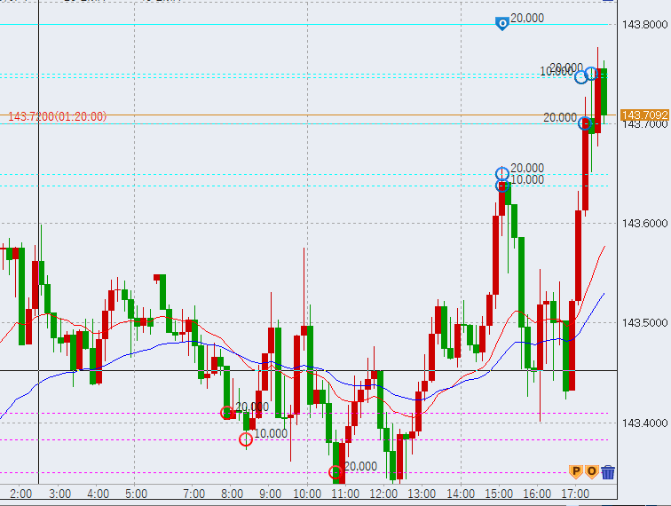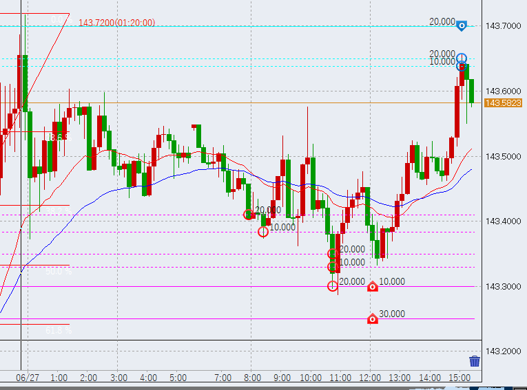 15時過ぎようやく上昇。売りは143.6に3万、その後0.05円毎に2万程度を追加予定。現状で含み益+2万円程度です。