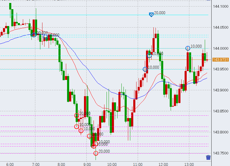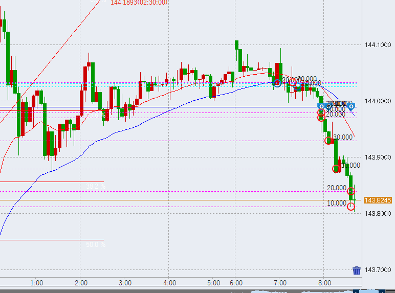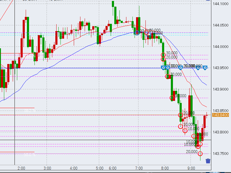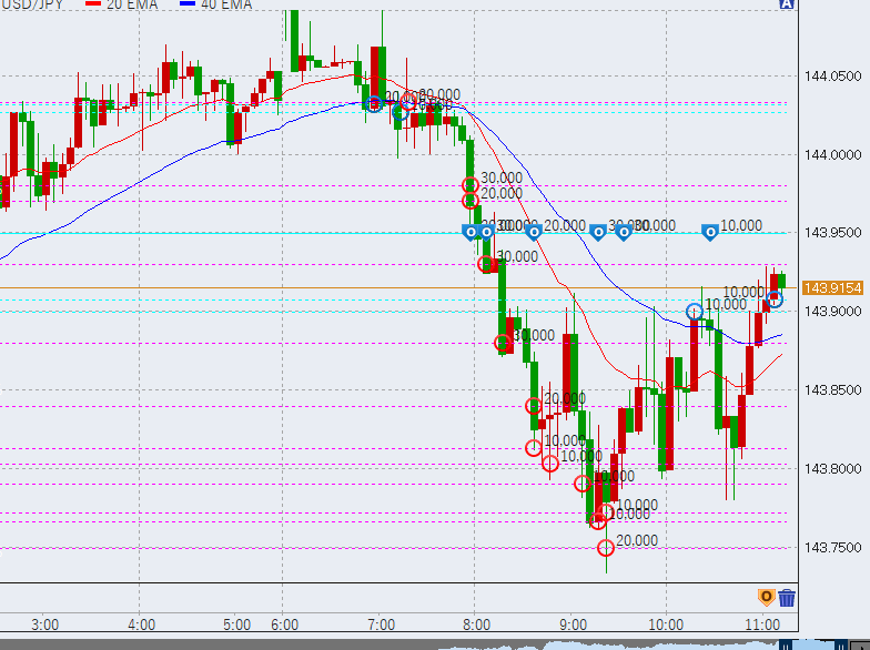 9時過ぎ143.75まで下落。上値が重くなってきていることから、少し早めに売り始めようと考えています。