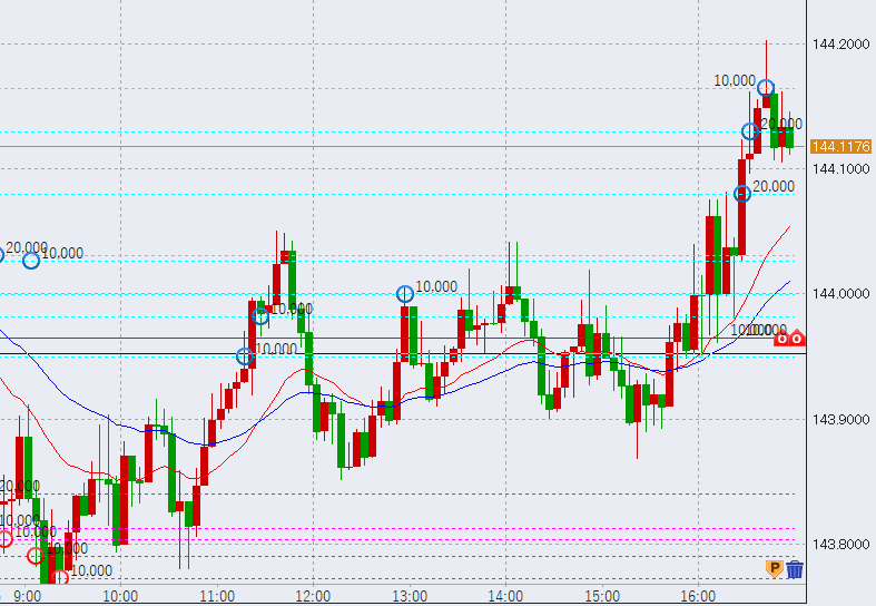 16時過ぎ上昇へ。買い9万、売り10万です。この後、もし144.2を上回るようであれば決済しようと思ってます。※+2万円程度の微益ですが、難しい相場なので逃げ。
