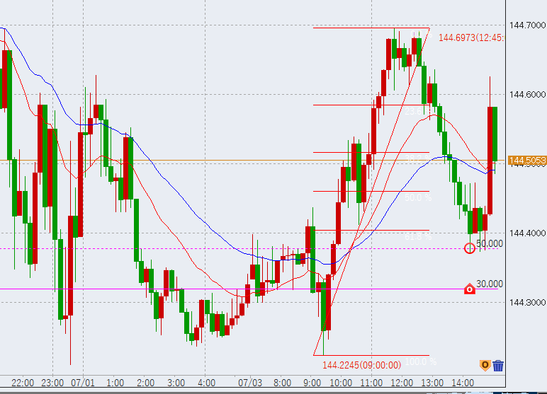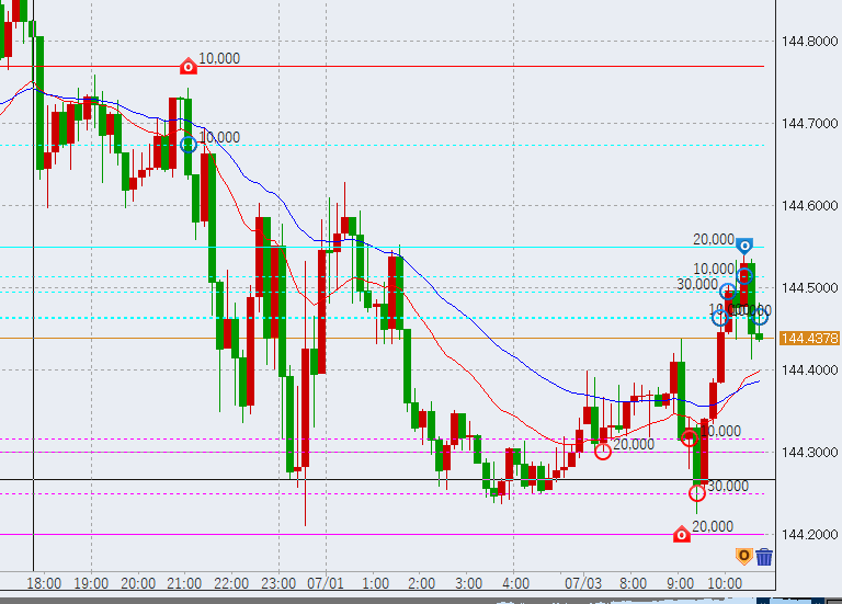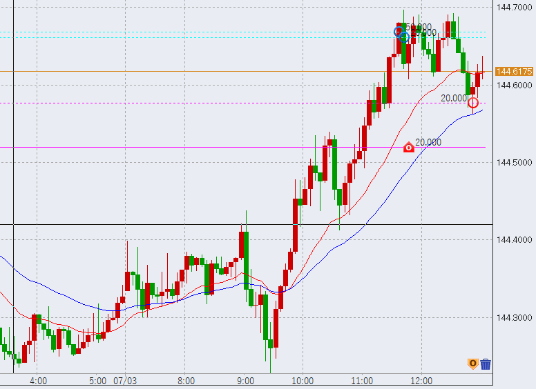 10時過ぎ反発し144.5まで上値を伸ばします。現状売り9万、買い6万となり、今度は買い増し予定。