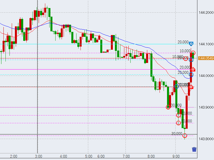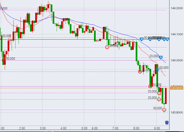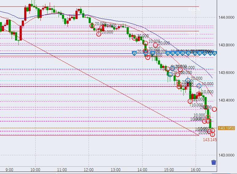 15時過ぎ、143.5円付近まで大きめの下落。