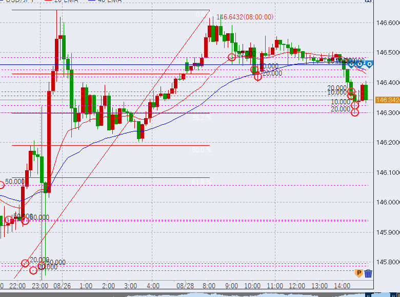 早朝の10分足です。先週ジャクソンホール前に50万を投入し、147円を待っています。147円へ到達したら、50万の決済ラインを敷き、さらに20万程度を追加投入する予定です。