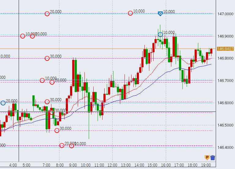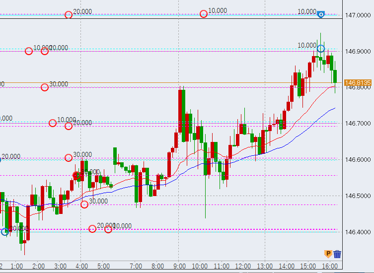 16時過ぎ、146.9円程度まで上昇。しかし、まだ前日高値(146.98円)までは届いていません。