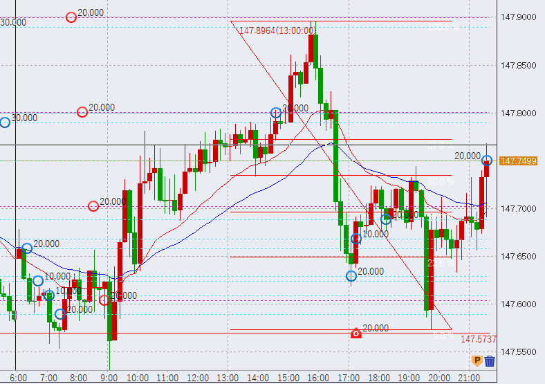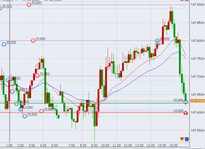 13時過ぎ高値超え。さらに上昇していく気配を見せています。なお最高値は147.95付近です。