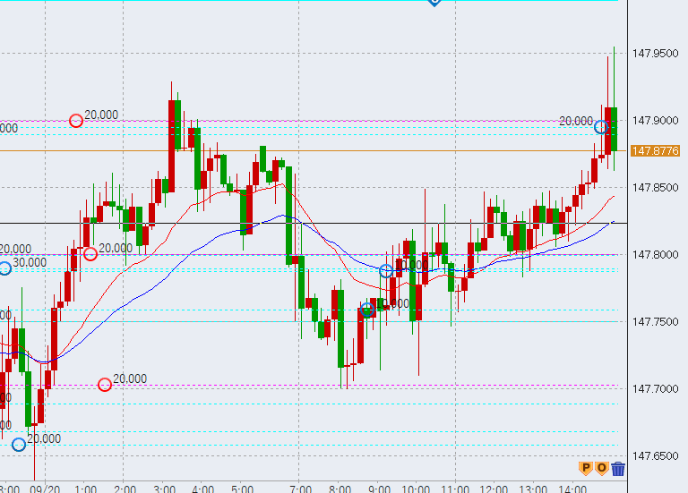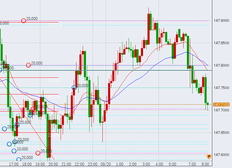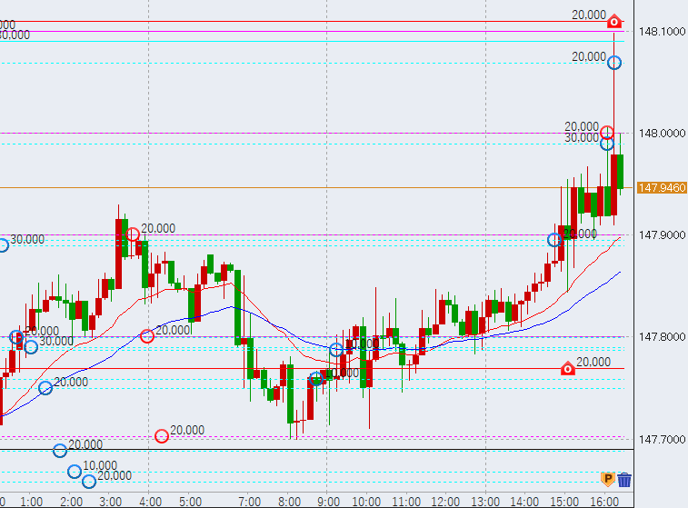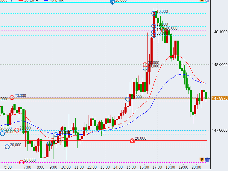 17時過ぎから反落。20時過ぎ、147.9円付近、下落の流れとなっています。