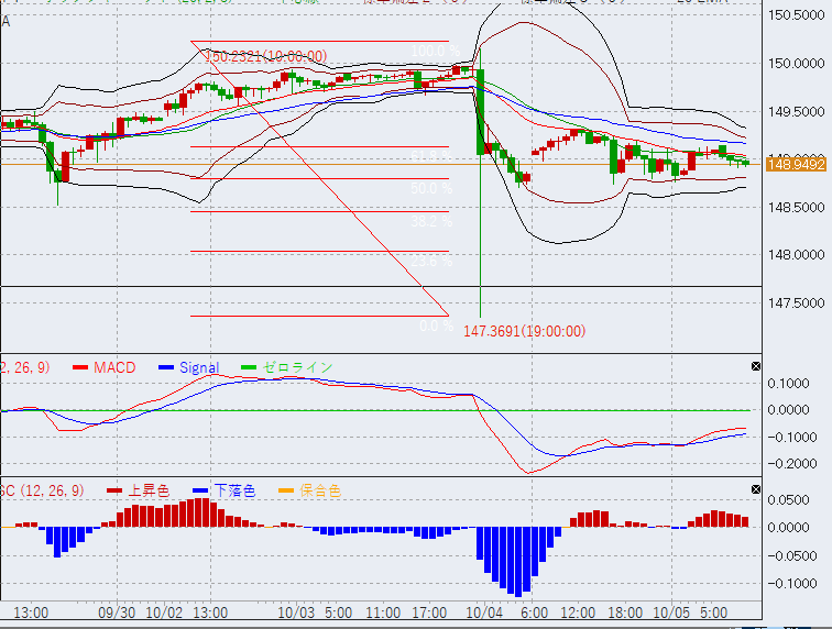 1時間足の状況。まずは高値149.3を抜けると勢いづくでしょう。一旦の下限は148.7円付近と見ています。