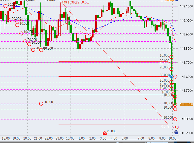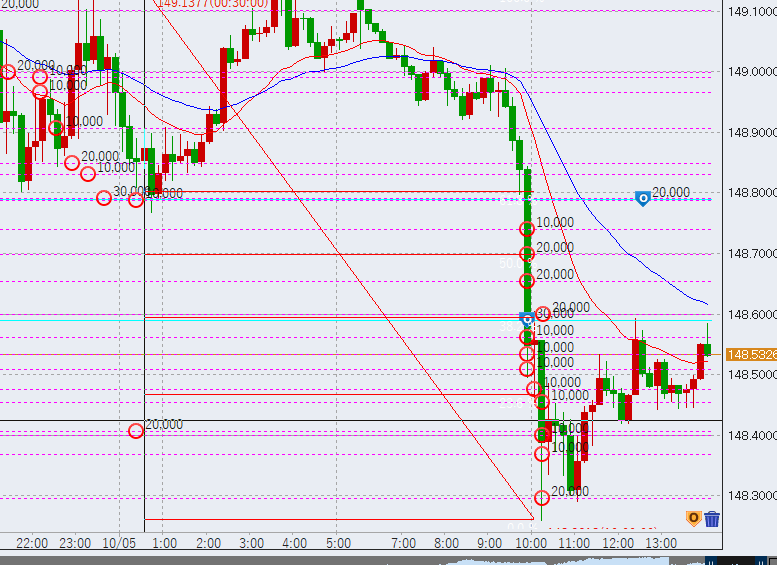 と思ったら急落し、148.3円まで下げてきました。底買い->ヘッジ売りの流れとなります。