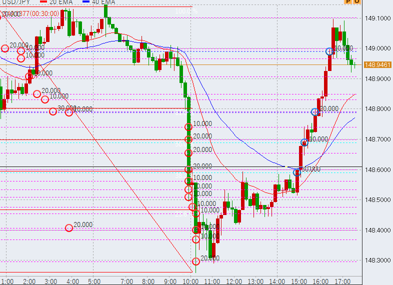 17時過ぎ。149円強まで勢いよく反発。この後、前日高値149.2まで伸びればさらに上昇する可能性があります。